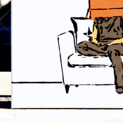 a young family is isolated from one another as both parents have cardboard boxes over their heads, symbolizing their insular worlds. their child reaches up in anguish and mimicry for its own box wedged between the parents’.